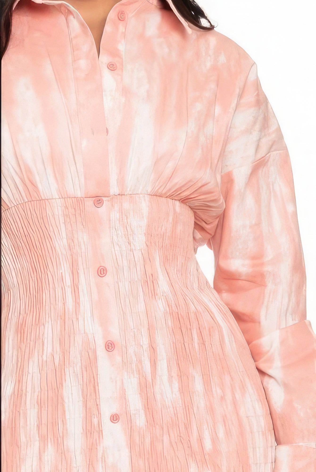 The design of the Tie Dye Mini Dress features ruched details that enhance your silhouette, while the front buttons introduce a stylish flair. This thoughtful design not only elevates the dress but also provides a versatile option that can be dressed up or down as needed. Imagine slipping into this dress for a day out, pairing it with your favorite sandals for a casual look, or dressing it up with heels for an evening event.