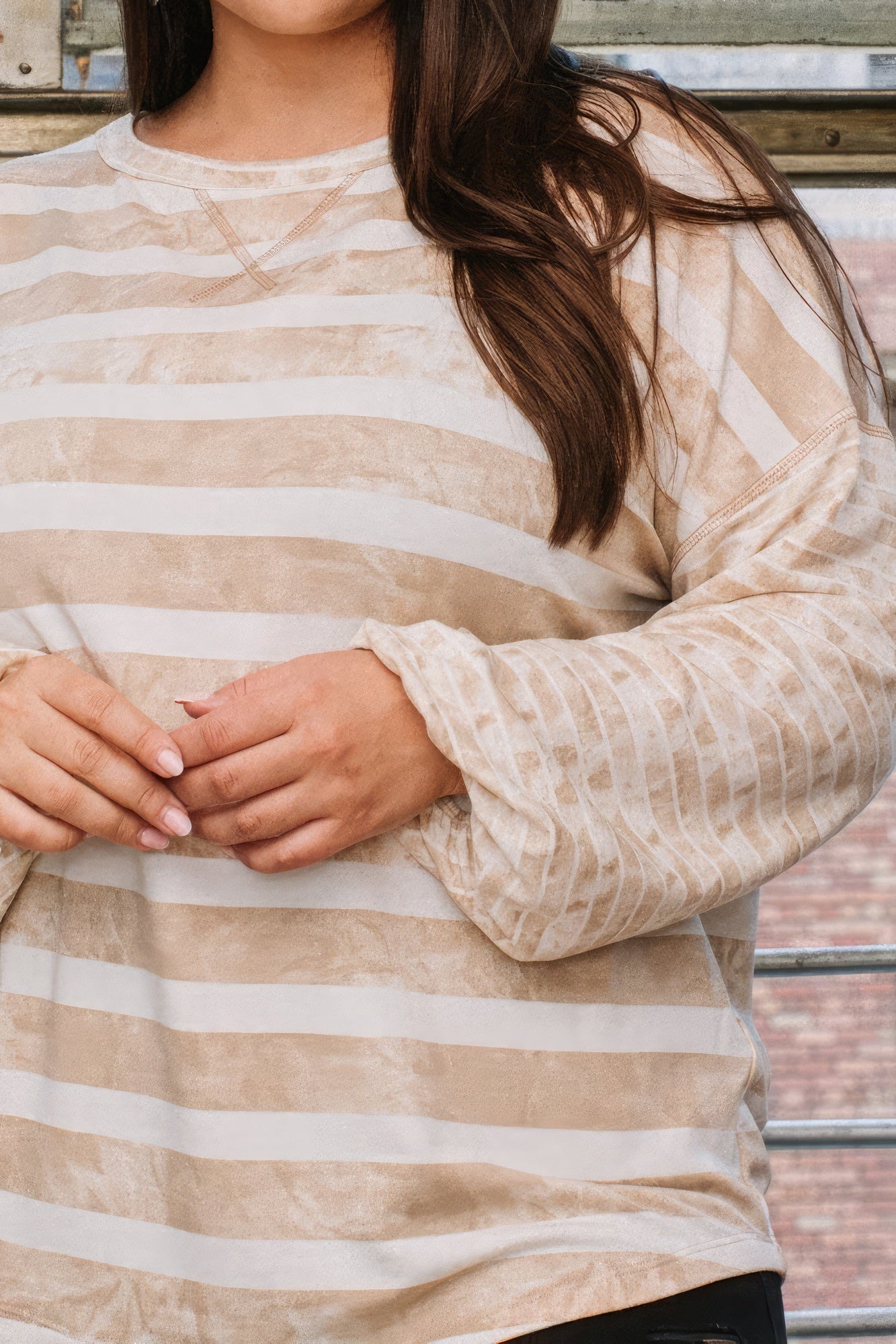 Don’t miss out on adding this stylish piece to your collection. Embrace the perfect fusion of fashion and comfort by adding the Stripe Printed French Terry Top in Taupe to your cart today!