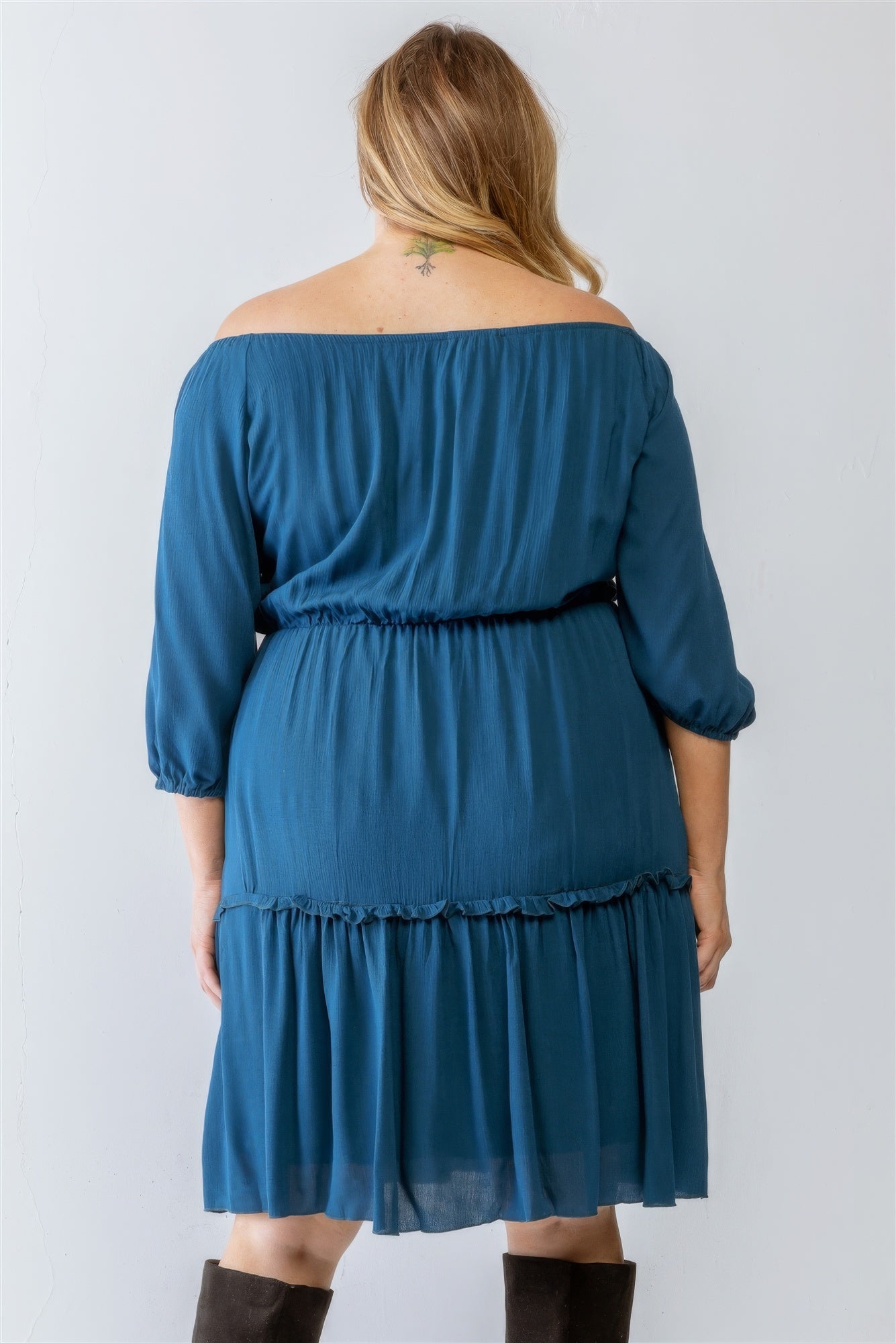 Add our Plus Combo Printed Textured Ruffle Flare Hem Mini Dress in teal to your cart now and redefine your fashion statement with this must-have piece!