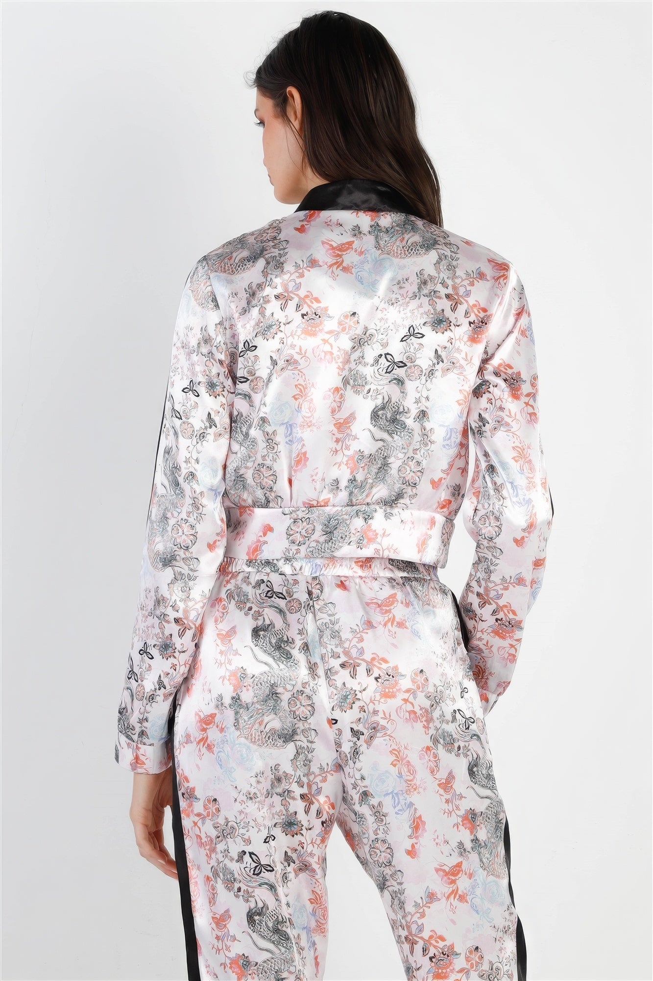 Don’t wait any longer! Add the Black Contrast Satin Effect Multi Color Print Zip-up Jacket & Pants Set to your cart now and step into a world of trendy comfort and stylish flair!