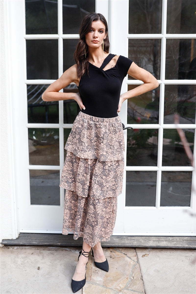 Introducing the Peach & Grey Lace Layered Ruffled Midi Skirt, a delightful addition to your wardrobe that perfectly balances elegance and playfulness. This skirt is designed for the modern woman who appreciates chic, girlish styles that can transition seamlessly from casual outings to more polished events. Imagine stepping out in this enchanting piece, where the soft hues of peach and grey come together to create a stunning visual that is both charming and versatile.